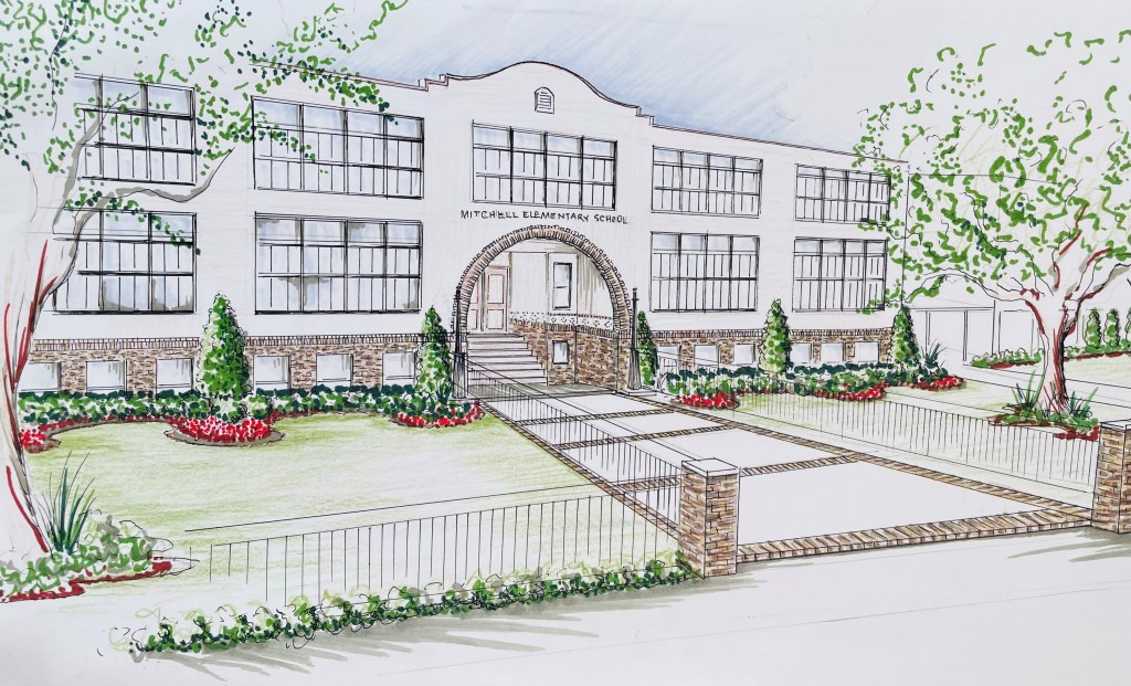 The Foundation continually supports capital improvements to the Mitchell Elementary school campus promoting the health and safety of our students. Projects have included carline and walkway awning, perimeter gate and fencing, covered court and fans, playground shade covering, landscaping, water refill station, track, picnic tables, benches, and turf. Last year’s Bash funded the school’s first outdoor classroom, providing a space for teachers and students to take learning beyond the classroom. In 2025, the Foundation seeks to expand and improve the outdoor experience with turf and beautification of both front lawns. See rendering below of this planned project. Should you be interested in supporting this effort, please consider a sponsorship or donation today.